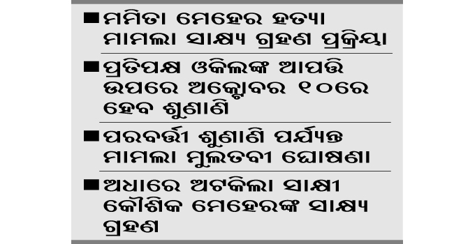 ବଲାଙ୍ଗୀର ଅଫିସ,୧ା୧୦ ଶୁକ୍ରବାର ବଲାଙ୍ଗୀର ଜିଲା କଣ୍ଟାବାଞ୍ଜି ଏଡିଜେ କୋର୍ଟରେ ବହୁଚର୍ଚ୍ଚିତ ମମିତା ମେହେର ହତ୍ୟା ମାମଲାର ଶୁଣାଣି ପ୍ରକ୍ରିୟାର ସାକ୍ଷ୍ୟ ଗ୍ରହଣ ଚାଲିଥିବା ବେଳେ ବଲାଙ୍ଗୀର ଏସ୍ପି ନିତିନ କୁଶଲକରଙ୍କ ଉପସ୍ଥିତିକୁ ନେଇ ଆପତ୍ତି ଉଠାଯାଇଛି । ଆପତ୍ତି...