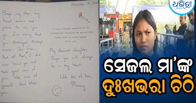 ବାଲେଶ୍ୱର,୧ା୧୨: ସାମ୍ନାକୁ ଆସିଛି ସେଜଲଙ୍କ ପାଳିତ ମା’ଙ୍କ ଆବେଗଭରା ଚିଠି। ଏଥିରେ ସେ ଲେଖିଛନ୍ତି, ତୁମେ ଚାଲିଯାଉଥିବାରୁ ମୋ ହୃଦୟ କଷ୍ଟ ଓ ଯନ୍ତ୍ରଣାରେ ଭରିଯାଉଛି। ମୁଁ ଦୁଃଖିତ ଯେ, ତୁମେ ତୁମ ମା’ଙ୍କ ନାଁରେ କଳଙ୍କ ଲଗାଇଦେଲ। ତୁମେ...