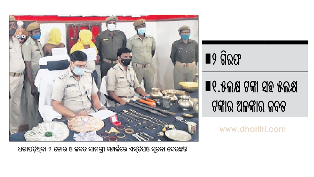 ଖଇରା/ଔପଦା, ୨୦।୧୨(ଡି.ଏନ.ଏ): ବାଲେଶ୍ୱର ଜିଲା ଔପଦା ଥାନା ଅଞ୍ଚଳରେ ୨ଚୋରଙ୍କୁୁ ଧରି ଗ୍ରାମବାସୀ ପୋଲିସ ଜିମା ଦେଇଛନ୍ତି। ୫ଦିନ ଧରି ଖୋଳତାଡ଼ ପରେ ସେମାନଙ୍କଠାରୁ ନଗଦ ୧.୫ଲକ୍ଷ ଟଙ୍କା ଓ ୫ଲକ୍ଷ ଟଙ୍କାର ଅଳଙ୍କାର ଉଦ୍ଧାର କରାଯାଇଛି। ରବିବାର ଉଭୟଙ୍କୁ କୋର୍ଟ...