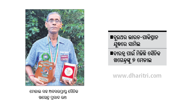 ସିମୁଳିଆ,୧୪।୧୧: ୧୯୬୫ ଓ ୧୯୭୧ ମସିହାରେ ଦୁଇଟି ଯୁଦ୍ଧର ସାମ୍ନା କରିଥିବା ବାଲେଶ୍ୱର ଜିଲା ସିମୁଳିଆ ବ୍ଲକ ଚାଲୁଣିଗାଁ ଅଞ୍ଚଳର ଖଗେନ୍ଦ୍ର ପ୍ରସାଦ ରଥ (୭୭)ଙ୍କୁ ବୀରତ୍ୱ ପାଇଁ ମିଳିଛି ସ୍ବତନ୍ତ୍ର ସମ୍ମାନ। ଭୁବନେଶ୍ୱରରେ ରାଜ୍ୟପାଳ ଓ ବାଲେଶ୍ୱର ଚାନ୍ଦିପୁର ପ୍ରତିରକ୍ଷା...