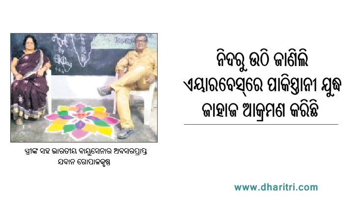 ବାଲେଶ୍ୱର ଅଫିସ, ୭।୧୧: ବାଲେଶ୍ୱରର ରାଣୀପାଟଣା ସ୍ଥିତ ବ୍ୟାଙ୍କକଲୋନୀରେ ଅବସ୍ଥାନ କରୁଛନ୍ତି ଭାରତୀୟ ବାୟୁସେନାର ଜଣେ ଅବସରପ୍ରାପ୍ତ ଯବାନ ଗୋପାଳକୃଷ୍ଣ ଦାସ। ୧୯୭୧ ଭାରତ-ପାକିସ୍ତାନର ଯୁଦ୍ଧ ବିଜୟର ସ୍ବର୍ଣ୍ଣିମ ଜୟନ୍ତୀ ଉତ୍ସବ ଶନିବାର ପରିବାର ସହ ପାଳନ କରିଛନ୍ତି। ଆଉ...