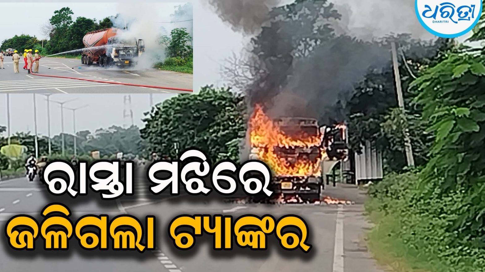ରାସ୍ତା ମଝିରେ ହୁତୁହୁତୁ ହୋଇ ଜଳିଗଲା ଟ୍ୟାଙ୍କର