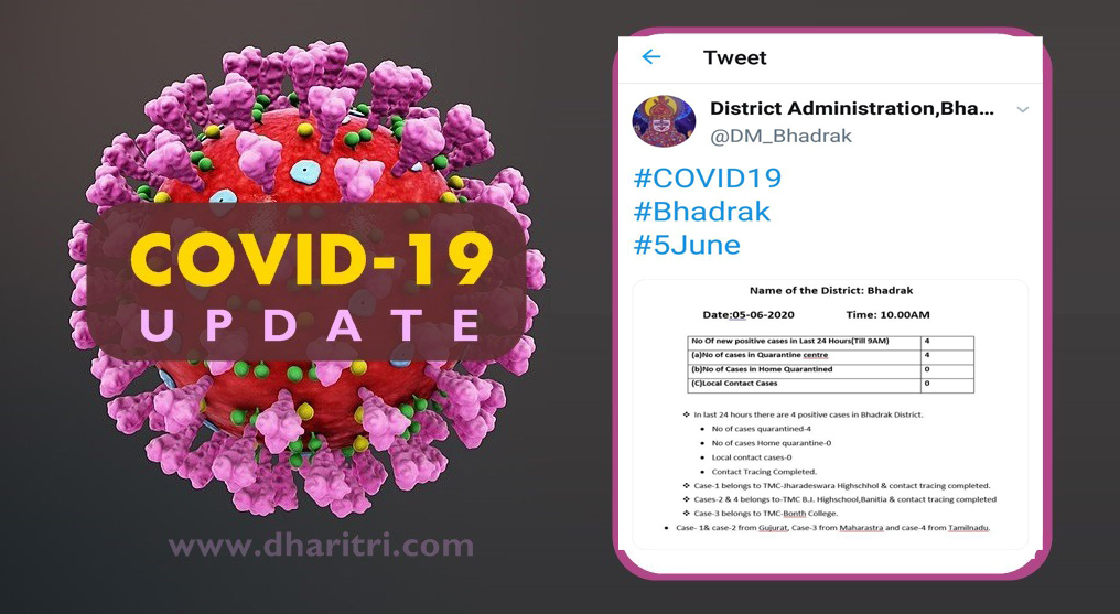 ଭଦ୍ରକରେ ପୁଣି ୪ କରୋନା ପଜିଟିଭ୍ ଚିହ୍ନଟ: ଆକ୍ରାନ୍ତଙ୍କ ସଂଖ୍ୟା ୧୩୩ ଛୁଇଁଲା