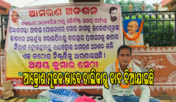 ଭଦ୍ରକ,୧୪।୮(ସନାତନ ରାଉତ): ଭଦ୍ରକ ଜିଲା ବନ୍ତ ବ୍ଲକ ଟିଲୋ ପଞ୍ଚାୟତ ଦେବତାଗଡ଼ିଆ ଗ୍ରାମର ଅକ୍ଷୟ ସେଠୀ ପ୍ରଧାନମନ୍ତ୍ରୀ ଆବାସ ଯୋଜନାରେ ଘର ଯୋଗାଇ ଦେବା ଦାବିରେ ସୋମବାର ଜିଲାପାଳଙ୍କ ଅଫିସ ଆଗରେ ଧାରଣାରେ ବସିଛନ୍ତି । ନିକଟରେ ପ୍ରକାଶ ପାଇଥିବା...
