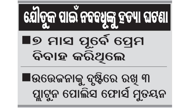 ସାଲେପୁର,୪।୨(ଡି.ଏନ୍.ଏ.): ସାଲେପୁର ଥାନା ଅନ୍ତର୍ଗତ ଗୁଆଳିପୁର ଗ୍ରାମର ଜଣେ ନବବଧୂଙ୍କ ଗୁରୁବାର ମୃତ୍ୟୁ ଘଟିଥିଲା। ସେ ହେଲେ ସେଖ୍ ରିୟାଜଙ୍କ ଝିଅ ସୁମେୟା ପରୱିନ୍। ଶାଶୁଘରେ ଲୋକେ ତାଙ୍କୁ ହତ୍ୟା କରାଯାଇଥିବା ନେଇ ଥାନାରେ ଅଭିଯୋଗ ହୋଇଥିଲା। ଏନେଇ ପୋଲିସ...