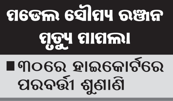 କଟକ ଅଫିସ,୩ା୮: ମଡେଲ ସୌମ୍ୟ ରଞ୍ଜନ ପାଣିଗ୍ରାହୀଙ୍କ ମୃତ୍ୟୁ ମାମଲାର ଅଗ୍ରଗତି ସମ୍ପର୍କିତ ରିପୋର୍ଟ ଦାଖଲ କରିବା ପାଇଁ ଭୁବନେଶ୍ୱର ଡିସିପିଙ୍କୁ ହାଇକୋର୍ଟ ନିର୍ଦ୍ଦେଶ ଦେଇଛନ୍ତି। ଏହି ଘଟଣା ସମ୍ପର୍କିତ ପୂର୍ବ ମାମଲାରେ ହାଇକୋର୍ଟଙ୍କ ନିର୍ଦ୍ଦେଶ ପାଳନରେ ଅବହେଳା ଅଭିଯୋଗ...