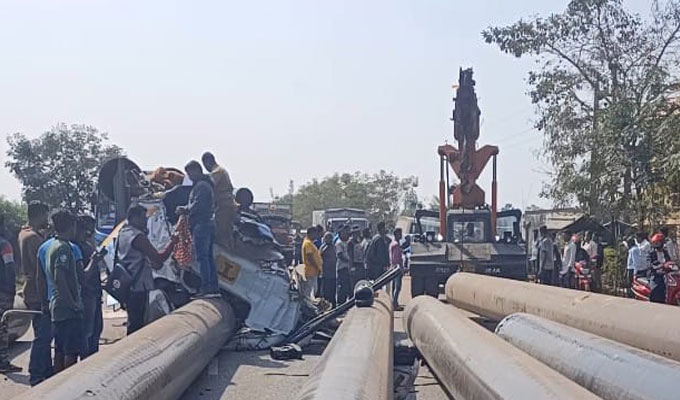 ଟ୍ରେଲରକୁ ପଛରୁ ପିଟିଲା ବସ୍ : କ୍ୟାବିନ୍ ଭାଙ୍ଗି ପଳାଇଲା ପାଇପ୍