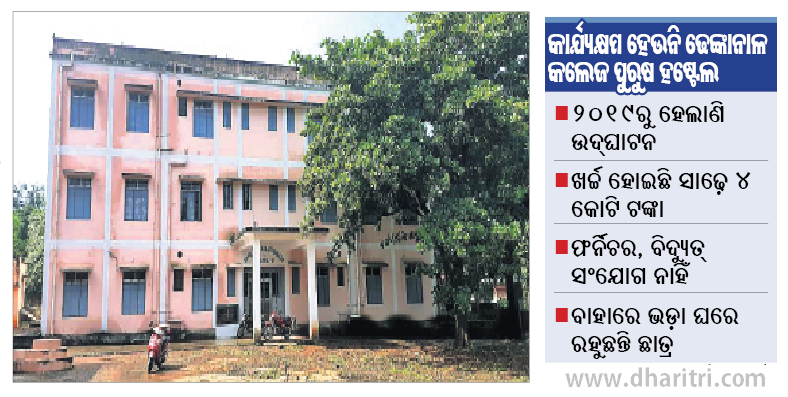 ଢେଙ୍କାନାଳ ଅଫିସ, ୪।୧୦: ସାଢ଼େ ୪ କୋଟି ଟଙ୍କାର ଛାତ୍ରାବାସ। ଉଦ୍ଘାଟନକୁ ବିତିଲାଣି ଅଢ଼େଇ ବର୍ଷ। ଅଥଚ କାର୍ଯ୍ୟକ୍ଷମ ହୋଇପାରୁନାହିଁ। କାରଣ ହଷ୍ଟେଲରେ ନାହିଁ ଫର୍ନିଚର କି ବିଦ୍ୟୁତ୍ ସଂଯୋଗ। ଅନ୍ଧକାରମୟ କୋଠାରେ ରହିବା ଅନ୍ତେବାସୀଙ୍କ ପକ୍ଷେ ସମ୍ଭବ ନ...