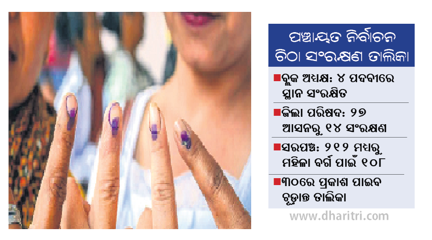 ଢେଙ୍କାନାଳ ଅଫିସ, ୧୦।୧୦: ତ୍ରିସ୍ତରୀୟ ପଞ୍ଚାୟତ ନିର୍ବାଚନ ଲାଗି ଶୁକ୍ରବାର ବିଳମ୍ବିତ ରାତିରେ ଢେଙ୍କାନାଳ ଜିଲାର ସଂରକ୍ଷଣ ଚିଠା ତାଲିକା ପ୍ରକାଶ ପାଇଛି। ସଂରକ୍ଷଣ ପରିସଂଖ୍ୟାନରୁ ଚଳିତ ନିର୍ବାଚନରେ ମହିଳାଙ୍କୁ ଗୁରୁତ୍ୱ ଦିଆଯାଇଥିବା ସ୍ପଷ୍ଟ ହୋଇଛି। ଜିଲାର ମୋଟ୍ ୨୭ ଜିଲା...