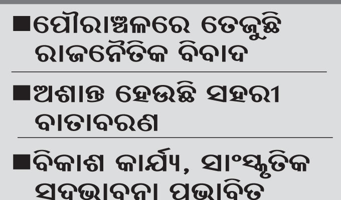 ଢେଙ୍କାନାଳ ଅଫିସ, ୧୦।୯: ଐତିହ୍ୟ, ସଂସ୍କୃତି ଓ ପରମ୍ପରାକୁ ନେଇ ସମୃଦ୍ଧ ଢେଙ୍କାନାଳ ସହର ରାଜନୀତିର ଜଟିଳ ଗଣିତରେ ଛନ୍ଦି ହୋଇପଡ଼ିଛି। ରାଜନୈତିକ ବିବାଦ ପାଇଁ ପୌର ନିର୍ବାଚନ ପରଠାରୁ ଅଶାନ୍ତ ହୋଇଉଠିଛି ସହରୀ ପରିବେଶ। ବିଜେଡି-ଭାଜପା ମଧ୍ୟରେ ଛକାପଞ୍ଝା...