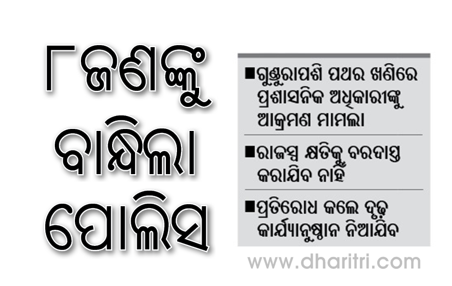ଢେଙ୍କାନାଳ ଅଫିସ, ୫।୫: ଢେଙ୍କାନାଳ ଜିଲା ଓଡ଼ାପଡ଼ା ତହସିଲ ଇନ୍ଦିପୁର ଗୁଣ୍ଡୁରାପଶି ପଥର ଖଣିରେ ଚଢ଼ାଉ ବେଳେ ପ୍ରଶାସନିକ ଅଧିକାରୀଙ୍କ ଉପରେ ହୋଇଥିବା ଆକ୍ରମଣ ମାମଲାରେ ପୋଲିସ କାର୍ଯ୍ୟାନୁଷ୍ଠାନ ଗ୍ରହଣ କରିଛି। ଏହି ଘଟଣାରେ ସମ୍ପୃକ୍ତି ଅଭିଯୋଗରେ ୮ଜଣ ବନ୍ଧା ହୋଇଛନ୍ତି।...