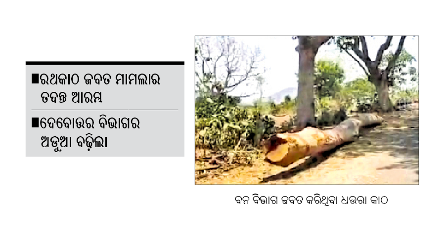 ଢେଙ୍କାନାଳ ଅଫିସ, ୮।୫: ବନ ବିଭାଗର ବିନା ଅନୁମତିରେ ରଥ ନିର୍ମାଣ ପାଇଁ କପିଳାସ ସଂରକ୍ଷିତ ଅଭୟାରଣ୍ୟରୁ ଧଉରା ଗଛ କାଟି ଅଡୁଆରେ ପଡ଼ିଛି ଢେଙ୍କାନାଳ ଜିଲା ଦେବୋତ୍ତର ବିଭାଗ। ଏଥିରେ ସମ୍ପୃକ୍ତ ଥିବା ବ୍ୟକ୍ତିଙ୍କ ବିରୋଧରେ କଡ଼ା କାର୍ଯ୍ୟାନୁଷ୍ଠାନ ଗ୍ରହଣ...