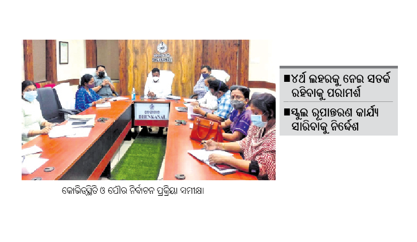 ଢେଙ୍କାନାଳ ଅଫିସ, ୯।୩: ଢେଙ୍କାନାଳ ଜିଲା କାର୍ଯ୍ୟାଳୟ ଓସ୍ଓ୍ବାନ୍ ହଲ୍ରେ ସୋମବାର ଅପରାହ୍ନରେ ଜିଲାପାଳ ସରୋଜ କୁମାର ସେଠୀ ଜିଲାର କୋଭିଡ୍ସ୍ଥିତି, ପୌର ନିର୍ବାଚନ ଏବଂ ୫-ଟି ବ୍ୟବସ୍ଥାରେ ହେଉଥିବା ବିଦ୍ୟାଳୟ ରୂପାନ୍ତରୀକରଣ କାର୍ଯ୍ୟର ସମୀକ୍ଷା କରିଛନ୍ତି। କରୋନା ସଂକ୍ରମଣ ସମ୍ପୂର୍ଣ୍ଣ...