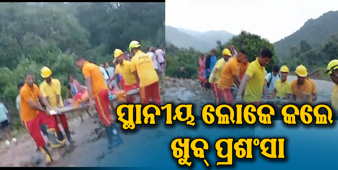 ବିପଦପୂର୍ଣ୍ଣ ପ୍ରଖର ନାଳ ଦେଇ ଗର୍ଭବତୀ ମହିଳାଙ୍କୁ କାନ୍ଧରେ ବୋହି ଆଣିଲେ ଅଗ୍ନିଶମ କର୍ମଚାରୀ