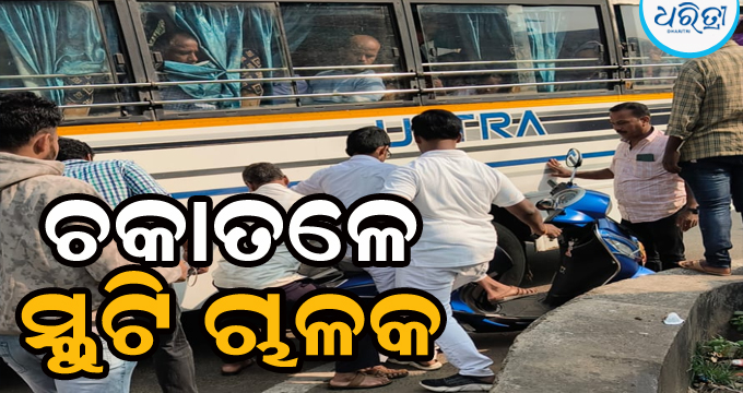 ଦ୍ରୁତଗତିରେ ଆସୁଥିଲା ବସ୍, ଚକାତଳେ ଫସିଗଲେ ସ୍କୁଟି ଚାଳକ