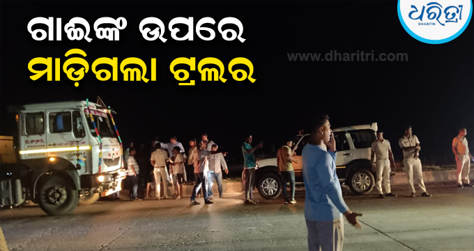 ରଙ୍ଗରୁଟ୍ରେ ଆସି ରାସ୍ତାରେ ଶୋଇଥିବା ଗାଈଙ୍କ ଉପରେ ମାଡ଼ିଗଲା ଟ୍ରଲର, ଘଟଣାସ୍ଥଳରେ ବଜରଙ୍ଗ ଦଳ