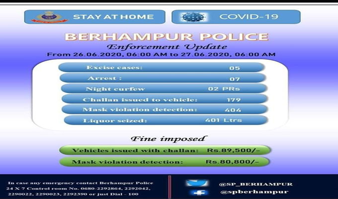 ବ୍ରହ୍ମପୁର ଅଫିସ,୨୭।୬: ଲକ୍ଡାଉନ ସମୟରେ ଅମାନିଆଙ୍କୁ ପୋଲିସ ଅଟକାଇ ପ୍ରତିଦିନ ଯାଞ୍ଚ କରି ଜରିମାନା ଆଦାୟ କରୁଛି । ଏପରିକି ଜନସାଧାରଣଙ୍କୁ ମାସ୍କ ପିନ୍ଧିବାକୁ ନିର୍ଦ୍ଦେଶ ଦିଆଯିବା ସହ ଯାଞ୍ଚ ବ୍ୟବସ୍ଥାକୁ କଡ଼ାକଡ଼ି କରାଯାଉଛି । ଶୁକ୍ରବାର ସକାଳୁ ଶନିବାର...