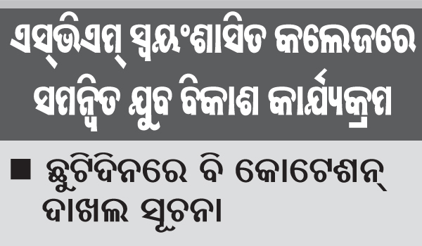 ଜଗତ୍ସିଂହପୁର, ୧୨ା୧୨(ପ୍ରମୋଦ କୁମାର ନାୟକ): ଉଚ୍ଚ ମାଧ୍ୟମିକ ବିଦ୍ୟାଳୟ ଓ ଡିଗ୍ରୀ ମହାବିଦ୍ୟାଳୟ ଗୁଡ଼ିକରେ ଅଧ୍ୟୟନରତ ଛାତ୍ରୀଛାତ୍ରଙ୍କ ମଧ୍ୟରେ ସାମାଜିକ, କ୍ରୀଡ଼ା ଓ ସାଂସ୍କୃତିକ କାର୍ଯ୍ୟରେ ସମ୍ପୃକ୍ତି ବୃଦ୍ଧି ପାଇଁ ରାଜ୍ୟ ସରକାର ପଦକ୍ଷେପ ନେଇଛନ୍ତି। ଛାତ୍ରୀଛାତ୍ରମାନେ କିପରି ନିଜର...