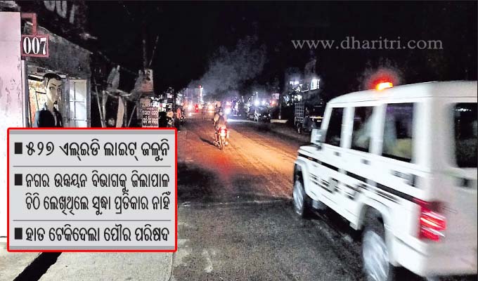 ଜଗତ୍ସିଂହପୁର ଅଫିସ,୭ା୪: ସନ୍ଧ୍ୟା ହେଲେ ଜଗତ୍ସିଂହପୁର ସହରରେ ଲୋକଙ୍କୁ ଅନ୍ଧାରୀ ଭୟ ଘାରୁଛି। କାରଣ ସହରର ପାଖାପାଖି ୬୦୦ ଖୁଣ୍ଟରେ ଏଲ୍ଇଡି ଲାଇଟ୍ ଜଳୁନି। ରାତିରେ କୌଣସି ଝିଅ, ବୋହୂ ବାହାରକୁ ବାହାରିବାକୁ ଡରୁଛନ୍ତି। ଯଦି କୌଣସି ଜରୁରୀ କାମରେ...