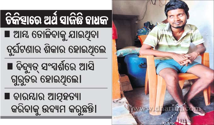କୁଜଙ୍ଗ,୨୭ା୬(ଡି.ଏନ୍.ଏ.): ବିଦ୍ୟୁତ୍ ସଂସ୍ପର୍ଶରେ ଆସି ମାନସିକ ସ୍ଥିତି ହରାଇବା ପରେ ବାରମ୍ବାର ଆତ୍ମହତ୍ୟା ଉଦ୍ୟମ କରିବାରୁ ଓ ଘର ଛାଡି ପଳାଇବାକୁ ଉଦ୍ୟମ କରିବାକୁ ଜଣେ ଯୁବକଙ୍କୁ ମା’ ବାପା ଶିକୁଳିରେ ବାଧ୍ୟିବାକୁ ବାଧ୍ୟ ହୋଇଛନ୍ତି। ଅର୍ଥ ଅଭାବକରୁ ତାଙ୍କ...