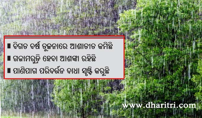 ଜଗତ୍ସିଂହପୁର ଅଫିସ,୨୦ା୬: କମ୍ ବର୍ଷା ଯୋଗୁ ଜଗତ୍ସିଂହପୁର ଜିଲାର ଚାଷୀ ଚିନ୍ତାରେ ପଡିଛନ୍ତି। କାରଣ ବର୍ଷା ହେଲେ ରଜ ପରେ ଚାଷୀ ବିଲରେ ବିହନ ବୁଣିବା କଥା। ବିଳମ୍ବ କଲେ ଅଗଷ୍ଟ ବେଳକୁ ପୋକ ଲାଗିବା ସମ୍ଭାବନା ଅଧିକ। ତେଣୁ...