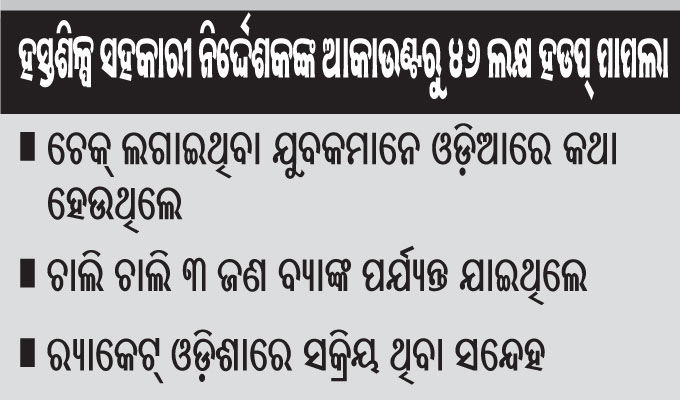 ଜଗତ୍ସିଂହପୁର ଅଫିସ,୨୬।୬: ଜଗତ୍ସିଂହପୁର ହସ୍ତଶିଳ୍ପ ସହକାରୀ ନିର୍ଦ୍ଦେଶକଙ୍କ ଆକାଉଣ୍ଟରୁ ୪୬,୧୨,୯୦୦ ଟଙ୍କା ଗାଏବ ମାମଲା ପୋଲିସ ପାଇଁ ବଡ଼ ଚ୍ୟାଲେଞ୍ଜ ସୃଷ୍ଟି କରିଛି। ଜାଲ୍ ଚେକ୍ ବଳରେ ବ୍ୟାଙ୍କ୍ ଅଫ୍ ବରୋଦା ଜଗତ୍ସିଂହପୁର ଶାଖାରୁ ଗତ ୧୭ ତାରିଖରେ କୋଲ୍କାତାସ୍ଥିତ...