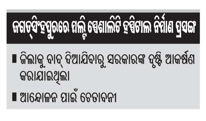 ଜଗତ୍ସିଂହପୁର ଅଫିସ, ୨୪ା୬: ରାଜ୍ୟର ୨୦ଟି ଜିଲାରେ ମଲ୍ଟି ସ୍ପେଶାଲିଟି ହସ୍ପିଟାଲ ହେବ ବୋଲି ପାଖାପାଖି ୪ ବର୍ଷ ପୂର୍ବରୁ ରାଜ୍ୟ ସରକାର ଘୋଷଣା କରିଥିଲେ। ଏହି ତାଲିକାରୁ ଜଗତ୍ସିଂହପୁର ଜିଲା ବାଦ୍ ପଡ଼ିଥିଲା। ସେଥିପାଇଁ ସେତେବେଳେ ଜିଲାବାସୀଙ୍କ ମଧ୍ୟରେ...
