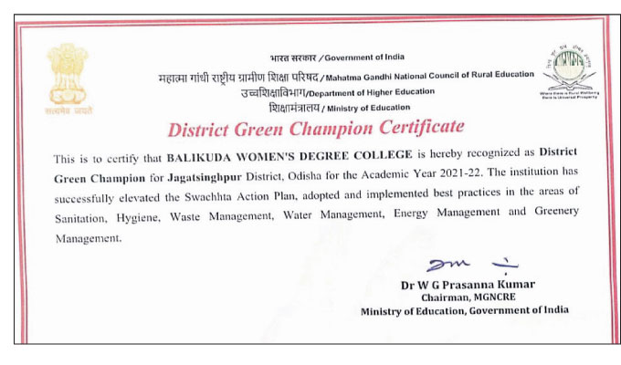 ଜଗତ୍ସିଂହପୁର ଅଫିସ, ୧୩।୪: ଭାରତ ସରକାରଙ୍କ ଶିକ୍ଷା ମନ୍ତ୍ରଣାଳୟ ତରଫରୁ ଜାତୀୟ ଗ୍ରାମୀଣ ଶିକ୍ଷା ପରିଷଦ ଦ୍ୱାରା କରାଯାଇଥିବା ସର୍ବେକ୍ଷଣରେ ବାଲିକୁଦା ମହିଳା ସ୍ନାତକ ମହାବିଦ୍ୟାଳୟକୁ ଡିଷ୍ଟ୍ରିକ୍ଟ ଗ୍ରୀନ ଚାମ୍ପିୟନ ହୋଇଛି। ୨୦୨୧-୨୨ ଶିକ୍ଷାବର୍ଷ ପାଇଁ ସ୍ବଚ୍ଛ ଆକ୍ସନ ପ୍ଲାନ୍...