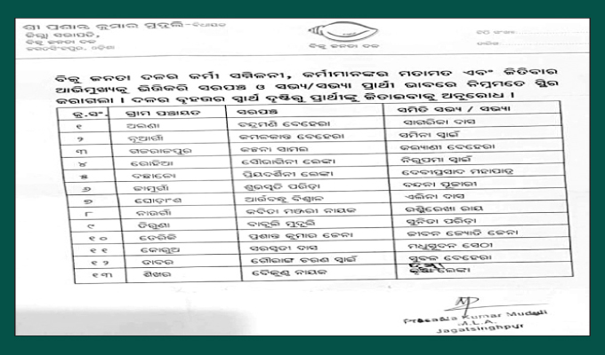 ଜଗତ୍ସିଂହପୁର ଅଫିସ, ୨୧ା୧: ତ୍ରିସ୍ତରୀୟ ପଞ୍ଚାୟତ ନିର୍ବାଚନରେ ସରପଞ୍ଚ, ସମିତି ସଭ୍ୟ ଓ ୱାର୍ଡ ମେମ୍ବର ପଦବୀ ପାଇଁ ରାଜନୈତିକ ଦଳ ପକ୍ଷରୁ ପ୍ରାର୍ଥୀ ହୋଇପାରିବେ ନାହିଁ ବୋଲି ନିୟମ ରହିଛି। କିନ୍ତୁ ଜଗତ୍ସିଂହପୁର ଜିଲାରେ ଏଥିରେ ବ୍ୟତିକ୍ରମ ଘଟିଛି।...