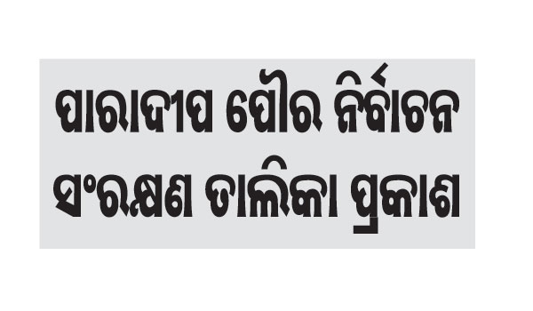 ପାରାଦୀପ, ୧୦।୧୧(ସ୍ବ.ପ୍ର.): ପାରାଦୀପ ପୌର ନିର୍ବାଚନ ପାଇଁ ମଙ୍ଗଳବାର ଚିଠା ସଂରକ୍ଷଣ ତାଲିକା ଘୋଷଣା କରାଯାଇଛି। ଜିଲାପାଳ ପାରୁଲ ପଟଓ୍ବାରିଙ୍କ ପକ୍ଷରୁ ଜାରି ବିଜ୍ଞପ୍ତିରେ ସମସ୍ତ ଓ୍ବାର୍ଡର ତାଲିକା ବଦଳି ଯାଇଛି। ଏଥିରେ ୫୦ ପ୍ରତିଶତରୁ ଊର୍ଦ୍ଧ୍ୱ ଆସନ ମହିଳାଙ୍କ...