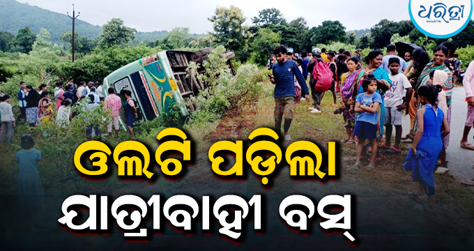 ଗୋରୁପଲଙ୍କୁ ବଞ୍ଚେଇବାକୁ ଯାଇ ଓଲଟି ପଡ଼ିଲା ଯାତ୍ରୀବାହୀ ବସ୍