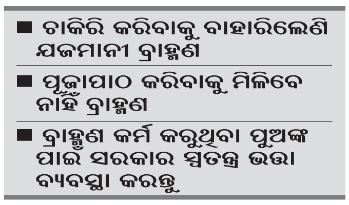କେନ୍ଦ୍ରପଡ଼ା,୭ା୭(ଜଗନ୍ନାଥ ଧଳ): କେନ୍ଦ୍ରାପଡ଼ା ଜିଲା ପଟ୍ଟାମୁଣ୍ଡାଇ ଅଞ୍ଚଳରେ ପୂଜାପାଠ କରୁଥିବା ବ୍ରାହ୍ମଣ ବରକୁ କନ୍ୟା ମିଳୁନାହାନ୍ତି। ଏଥିଯୋଗୁ ବ୍ରାହ୍ମଣ ପୁଅ ଏବେ ଯଜମାନୀ ଛାଡ଼ି ବିଦେଶରେ ଚାକିରି…