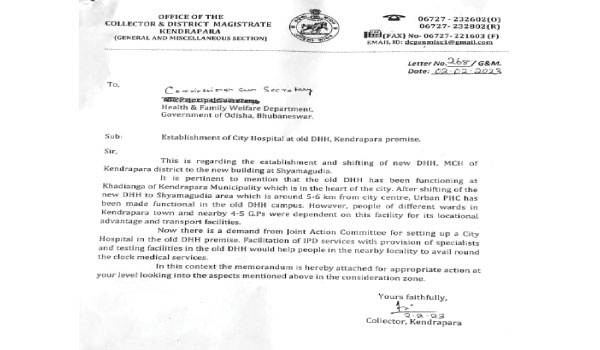 କେନ୍ଦ୍ରାପଡ଼ା ଅଫିସ, ୪ା୨: ଗୁରୁବାର କଥାବାର୍ତ୍ତା ସରିଥିଲା। ଜିଲାପାଳ ରାଜ୍ୟ ସରକାରଙ୍କୁ ସହରର ଖଡ଼ଇଙ୍ଗସ୍ଥିତ ପୁରୁଣା ଜିଲା ମୁଖ୍ୟ ଚିକିତ୍ସାଳୟ ପରିସରରେ ସିଟି ହସ୍ପିଟାଲ ସ୍ଥାପନ ପାଇଁ ଚିଠି ଲେଖିବେ। ଏହାପରେ ଗତ ୨୪ ତାରିଖଠାରୁ ସିଟି ହସ୍ପିଟାଲ ଦାବିରେ...