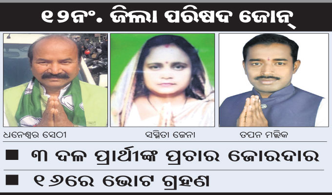 କେନ୍ଦ୍ରାପଡ଼ା ଅଫିସ, ୧୦ା୨: କେନ୍ଦ୍ରାପଡ଼ା ବ୍ଲକ ୬ ନଂ. ଜୋନ୍ରେ ଆସନ୍ତା ୨୨ରେ ନିର୍ବାଚନ ହେବ। ପ୍ରାର୍ଥୀମାନଙ୍କ ପ୍ରଚାର ଦିନକୁ ଦିନ ଜୋରଦାର ହୋଇଛି। କେନ୍ଦ୍ରାପଡ଼ା ବିଧାନସଭା ନିର୍ବାଚନମଣ୍ଡଳୀର ଏହି ଜୋନ୍ ଉଭୟ ଶାସକ ବିଜେଡି ଓ ଭାଜପା ପାଇଁ...