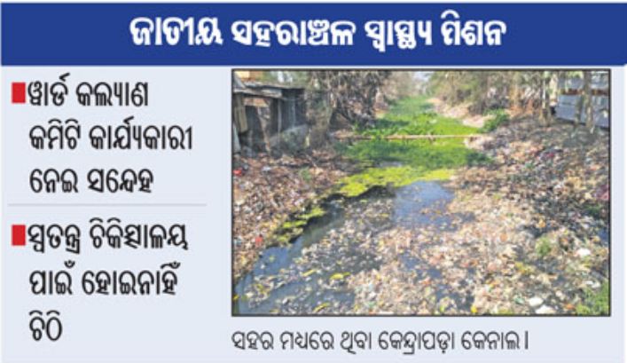 କେନ୍ଦ୍ରାପଡ଼ା ଅଫିସ, ୧୪।୮ – ୨୦୧୪ ଫେବୃୟାରୀ ୨୩ରୁ ରାଜ୍ୟରେ ଜାତୀୟ ସହରାଞ୍ଚଳ ସ୍ବାସ୍ଥ୍ୟ ମିଶନ ଆରମ୍ଭ ହେଲାଣି। ତେବେ କେନ୍ଦ୍ରାପଡ଼ା ସହରରେ ଏହି ମିଶନ ସମ୍ପୂର୍ଣ୍ଣ ଭାବେ କାର୍ଯ୍ୟକାରୀ ହୋଇପାରି ନାହିଁ। ୨୪ଟି ମହିଳା ଆରୋଗ୍ୟ ସମିତି ଗଠନ...