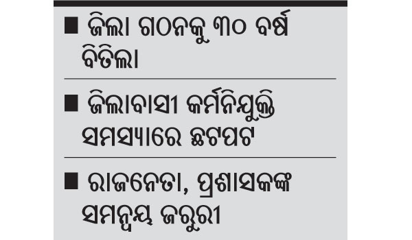 କେନ୍ଦ୍ରାପଡ଼ା ଅଫିସ, ୧ା୪: ରାଜ୍ୟ ସରକାର ୧୯୯୩ ଏପ୍ରିଲ ୧ରେ ଅବିଭକ୍ତ କଟକ ଜିଲାକୁ ଭାଗ କରି କେନ୍ଦ୍ରାପଡ଼ାକୁ ସ୍ବତନ୍ତ୍ର ଜିଲା ମାନ୍ୟତା ପ୍ରଦାନ କରିଥିଲେ। ଇତିମଧ୍ୟରେ ଏହି ଜିଲା ମାନ୍ୟତାକୁ ୩୦ ବର୍ଷ ବିତିଛି। ଜିଲା ଗଠନ ପରେ...