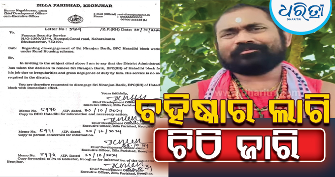 ହାଟଡିହୀ,୩୧l୧୦(ଶୁଭକାନ୍ତ ନାୟକ): କେନ୍ଦୁଝର ଜିଲା ହାଟଡିହୀ ବ୍ଲକର ରୁରାଲ ହାଉସିଂ ବିପିସି (ବ୍ଲକ ପ୍ରୋଜେକ୍ଟ କୋଅର୍ଡିନେଟର) ନିରଞ୍ଜନ ବାରିକଙ୍କୁ କାର୍ଯ୍ୟରୁ ବହିଷ୍କାର ପାଇଁ କେନ୍ଦୁଝର ସିଡିଓ କୁମାର ନାଗଭୂଷଣ ସମ୍ପୃକ୍ତ ଆଉଟ ସୋର୍ସିଙ୍ଗ ସଂସ୍ଥାକୁ ଚିଠି ଜାରି କରିଛନ୍ତି l...