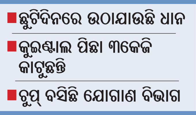 ଖୋର୍ଦ୍ଧା ଅଫିସ,୧୮।୧: ଖୋର୍ଦ୍ଧା ଜିଲାରେ ଧାନକିଣାରେ ବ୍ୟାପକ ଅନିୟମିତତା ହେଉଥିବା ଦେଖିବାକୁ ମିଳିଛି। ଧାର୍ଯ୍ୟ ଦିନ ପରିବର୍ତ୍ତେ ଛୁଟିଦିନରେ ଧାନ ଉଠାଯାଉଛି। ମଣ୍ଡିକୁ ଧାନ ଆସିବା ପରିବର୍ତ୍ତେ…