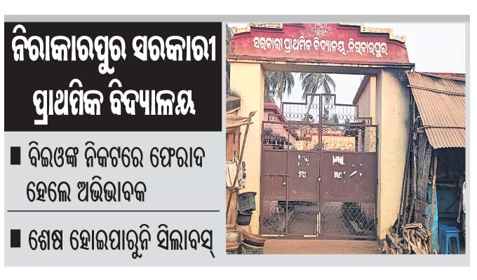 ନିରାକାରପୁର,୪।୩(ଡି.ଏନ୍.ଏ.): ଖୋର୍ଦ୍ଧା ଜିଲା ଟାଙ୍ଗୀ ଶିକ୍ଷା ସର୍କଲ ଅନ୍ତର୍ଗତ ନିରାକାରପୁର ପଞ୍ଚାୟତସ୍ଥିତ ଚିତ୍ରକୂଟ ବିହାରରେ ଥିବା ସରକାରୀ ପ୍ରାଥମିକ ବିଦ୍ୟାଳୟରେ ଦୀର୍ଘ ମାସେ ହେବ ପାନୀୟ ଜଳର ଉକତ୍ଟ ସମସ୍ୟା ଦେଖାଯାଉଛି। ପାଣି ନ ଥିବାରୁ ଛାତ୍ରୀଛାତ୍ର, ଶିକ୍ଷକ ନାନା...
