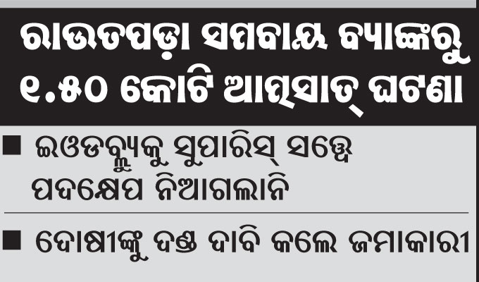 ଖୋର୍ଦ୍ଧା ଅଫିସ,୨୫ା୬: ଖୋର୍ଦ୍ଧା କେନ୍ଦ୍ର ସମବାୟ ବ୍ୟାଙ୍କ ଅଧୀନ ବେଗୁନିଆ ବ୍ଲକ ରାଉତପଡ଼ା ଶାଖାରୁ ଜମାକାରୀଙ୍କ ୧.୫୦ କୋଟି ଟଙ୍କା ଆତ୍ମସାତ୍ କରାଯାଇଥିବା ନେଇ ଅଭିଯୋଗ ହୋଇଥିଲା। ତତ୍କାଳୀନ ଜିଲାପାଳ ସଂଗ୍ରାମ କେଶରୀ ମହାପାତ୍ର ଏହି ଘଟଣାର ତଦନ୍ତ ଲାଗି...