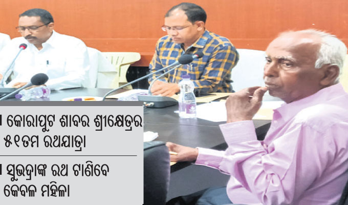 କୋରାପୁଟ,୧।୬(ସ୍ବ.ପ୍ର.): କୋରାପୁଟ ଶାବର ଶ୍ରୀକ୍ଷେତ୍ରରେ ଚଳିତ ବର୍ଷ ୫୧ତମ ରଥଯାତ୍ରା ପାଳନ ନେଇ ବୁଧବାର ସ୍ଥାନୀୟ ସଦ୍ଭାବନା ସଭାଗୃହରେ ଅତିରିକ୍ତ ଜିଲାପାଳ ରାମେଶ୍ୱର ପ୍ରଧାନଙ୍କ ଅଧକ୍ଷତାରେ ଏକ…