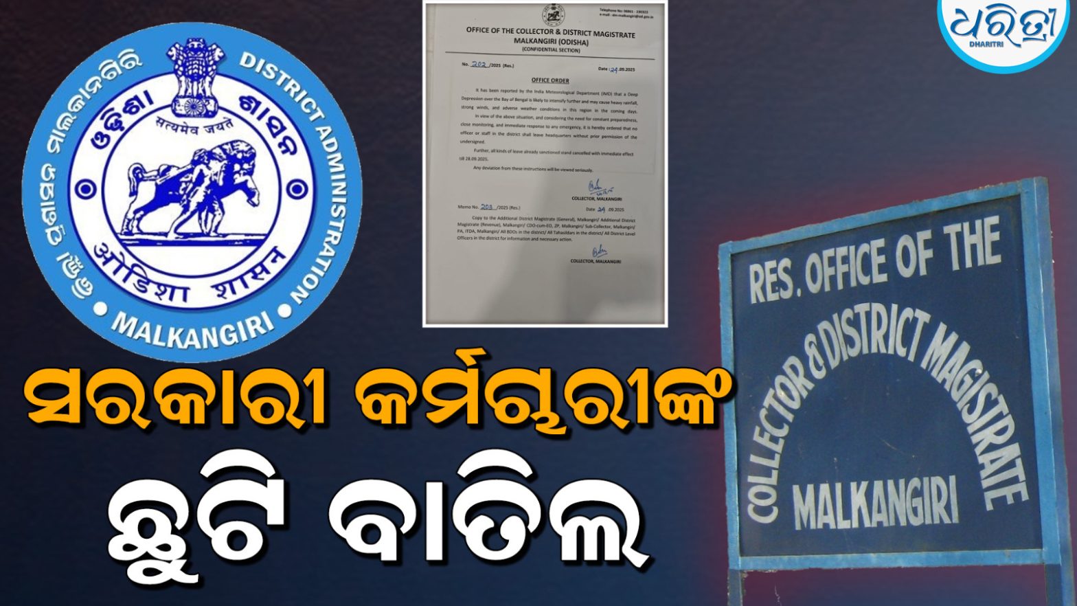 ମାଲକାନଗିରି,୨୪ା୯: ମାଲକାନଗିରି ଜିଲାରେ ସରକାରୀ କର୍ମଚାରୀଙ୍କ ଛୁଟି ବାତିଲ କରାଯାଇଛି। ଆସନ୍ତା ୨୮ ତାରିଖ ପର୍ଯ୍ୟନ୍ତ ସମସ୍ତ କର୍ମଚାରୀଙ୍କ ଛୁଟି ବାତିଲ କରିଛନ୍ତି ଜିଲା ପ୍ରଶାସନ। ପ୍ରବଳ ବର୍ଷା ସମ୍ଭାବନାକୁ ଦୃଷ୍ଟିରେ ରଖି ଜିଲାପାଳ ଏହି ଛୁଟି ବାତିଲ କରିଛନ୍ତି।...