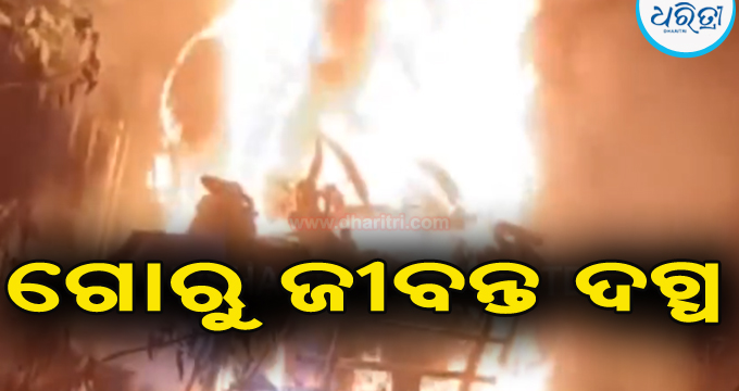 ଦୁର୍ଘଟଣା ପରେ ଜଳିଗଲା ଗୋରୁ ବୋଝେଇ ପିକଅପ୍ ଭ୍ୟାନ୍