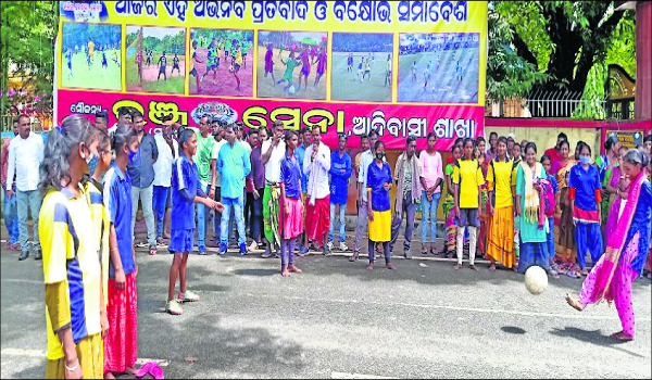 ବାରିପଦା ଅଫିସ,୮।୧୦: ମୟୂରଭଞ୍ଜ ଜିଲାରେ ଫୁଟବଲ ଏକାଡେମୀ ପ୍ରତିଷ୍ଠା ଦାବିରେ ଭଞ୍ଜସେନା ପକ୍ଷରୁ ଅଭିନବ ପ୍ରତିବାଦ ପ୍ରଦର୍ଶନ କରାଯାଇଛି। ଶୁକ୍ରବାର ଜିଲାପାଳଙ୍କ କାର୍ଯ୍ୟାଳୟ ସମ୍ମୁଖରେ ଖେଳାଳିମାନେ ଖେଳ ପୋଷାକ ପରିଧାନ କରି ଫୁଟ୍ବଲ ମ୍ୟାଚ୍ ଖେଳିଛନ୍ତି। ଫୁଟ୍ବଲର ଏନ୍ତୁଡ଼ିଶାଳ କୁହାଯାଉଥିବା...