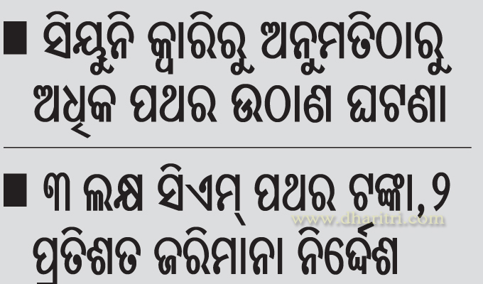 ନବରଙ୍ଗପୁର,୧୭ା୬(ସଦାଶିବ ପ୍ରହରାଜ) ଭାରତମାଳା ସଡ଼କ ପାଇଁ ସିୟୁନି କ୍ବାରିରୁ ଠିକା ସଂସ୍ଥା ପଥର ଖନନ କରୁଛି । ସରକାରୀ ଖଣି ନିୟମ ଉଲ୍ଲଂଘନକରି ସଂସ୍ଥା ଅନୁମତିଠାରୁ ୩ ଲକ୍ଷରୁ ଅଧିକ ସିଏମ୍ ପଥର ଫଟାଇ ଉଠାଇ ଚାଲିଛନ୍ତି। ୩ ମିଟର...