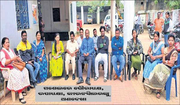 ପୌର କାର୍ଯ୍ୟାଳୟ ଆଗରେ ଧାରଣା ଦେଲେ ଅଧ୍ୟକ୍ଷ, ଉପାଧ୍ୟକ୍ଷା
