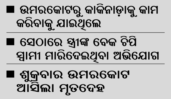 ଉମରକୋଟ, ୨୪।୯(ସ୍ବ.ପ୍ର.): କାମ କରିବାକୁ ଉମରକୋଟର ସିଲାଟି ଗ୍ରାମର ମାଣିକ ଘୋଷ ସପରିବାର ଯାଇଥିଲେ ଆନ୍ଧ୍ରପ୍ରଦେଶର କାକିନାଡ଼ା। ସେଠାରେ କିନ୍ତୁ ସ୍ତ୍ରୀ ଲିପିକାଙ୍କ ତଣ୍ଟି ଚିପି ହତ୍ୟା କରିଛନ୍ତି। ପ୍ରତ୍ୟେକ୍ଷଦର୍ଶୀ ଥିବା ଅଢ଼େଇବର୍ଷର ଝିଅ ପୋଲିସ ଆଗରେ ଘଟଣା ସମ୍ପର୍କରେ...