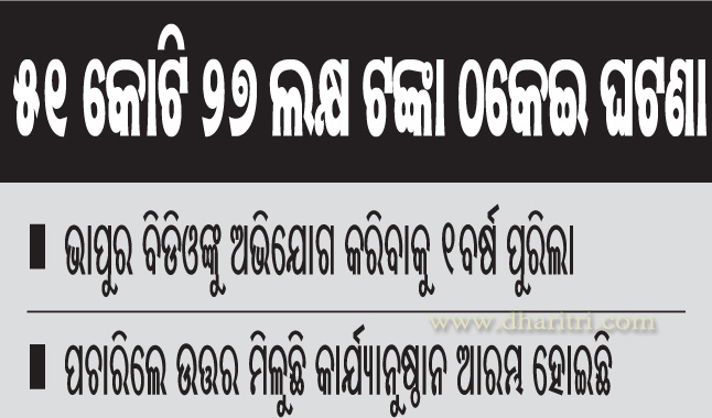 ନୟାଗଡ଼/ଭାପୁର,୨୮।୯(ଲୋକନାଥ ମିଶ୍ର/ଭରତ କୁମାର ବେହେରା)ଭେଣ୍ଡର ଆକାଉଣ୍ଟ ଖୋଲି ନୟାଗଡ଼ ଜିଲାର ଭାପୁର ବ୍ଲକରେ ୫୧ କୋଟି ୨୭ ଲକ୍ଷ ଠକେଇ ଘଟଣାରେ କାର୍ଯ୍ୟାନୁଷ୍ଠାନ ନ ଥିବାରୁ ଅସନ୍ତୋଷ ପ୍ରକାଶ ପାଇଛି। ମହାତ୍ମାଗାନ୍ଧୀ ଜାତୀୟ ଗ୍ରାମୀଣ ନିଶ୍ଚିତ କର୍ମ ନିଯୁକ୍ତି ଯୋଜନା(ଏମଜିଏନ୍ଆର୍ଇଜିଏସ୍)ରେ...