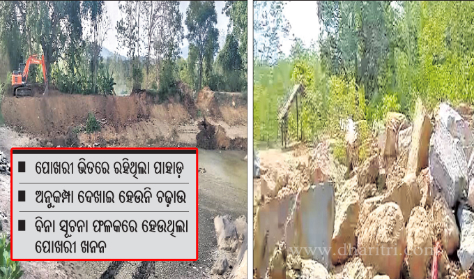 ନୟାଗଡ଼, (ଲୋକନାଥ ମିଶ୍ର)/ଓଡ଼ଗାଁ (ଆଦର୍ଶ କୁମାର ପଟ୍ଟନାୟକ),୧୬।୬: ନୟାଗଡ ଜିଲା ଓଡ଼ଗାଁ ବ୍ଳକ ପାଣ୍ଡେରୀପଡ଼ା ପଞ୍ଚାୟତ ପାଣ୍ଡେରୀପଡ଼ା ବଡ଼ ପୋଖରୀ ଖୋଳାରେ ଅନିୟମିତତା ହୋଇଥିବାବେଳେ ପୋଖରୀ ଭିତରେ ଡୁବୁରୀ ପାହାଡକୁ କାଟି ୫୦୦ ଟ୍ରିପ କଳା ମୁଗୁନି ପଥର ଲୁଟିବା...