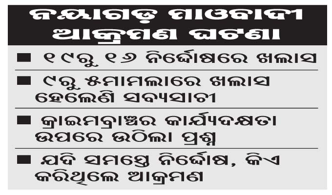 ନୟାଗଡ଼ ଅଫିସ,୩।୪: କୋର୍ଟରେ ପ୍ରମାଣ ଅଭାବରୁ ଖସି ଯାଉଛନ୍ତି ମାଓବାଦୀ। ବିଭିନ୍ନ ସମୟରେ ଗିରଫ ହୋଇଥିବା ୧୯ ଅଭିଯୁକ୍ତ ମାଓବାଦୀରୁ ୧୬ ଜଣ ନିର୍ଦ୍ଦୋଷରେ ଖଲାସ ହୋଇ ସାରିଲେଣି। ଅନ୍ୟପକ୍ଷେ ଜେଲରେ ଥିବାବେଳେ ୨୦୦୯ରେ ଶୁଭଙ୍କର ଓ ୨୦୨୧ରେ ରବି...